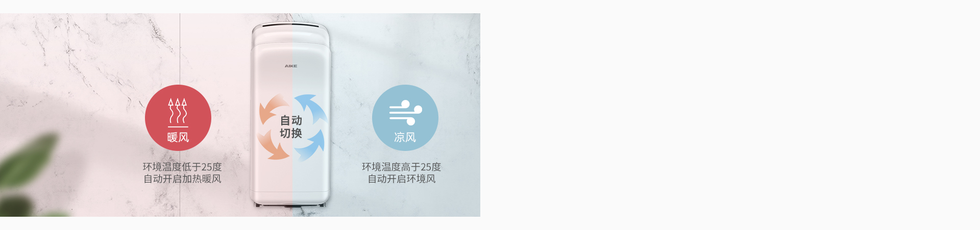 无需开关调节,AIKE SmartWarm™智暖科技™自动根据室温切换风温,夏天吹凉风,冬天吹暖风,更懂用户的干手需求